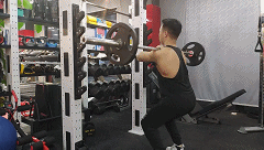For safety reasons, you can also use a squat rack to complete the movement. Lean the barbell against the top of the deltoid muscle, grab the bar with your arms crossed, then bend your hips and then your knees to do squats.