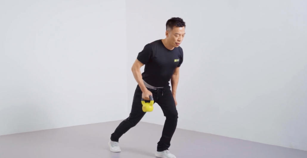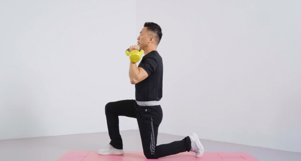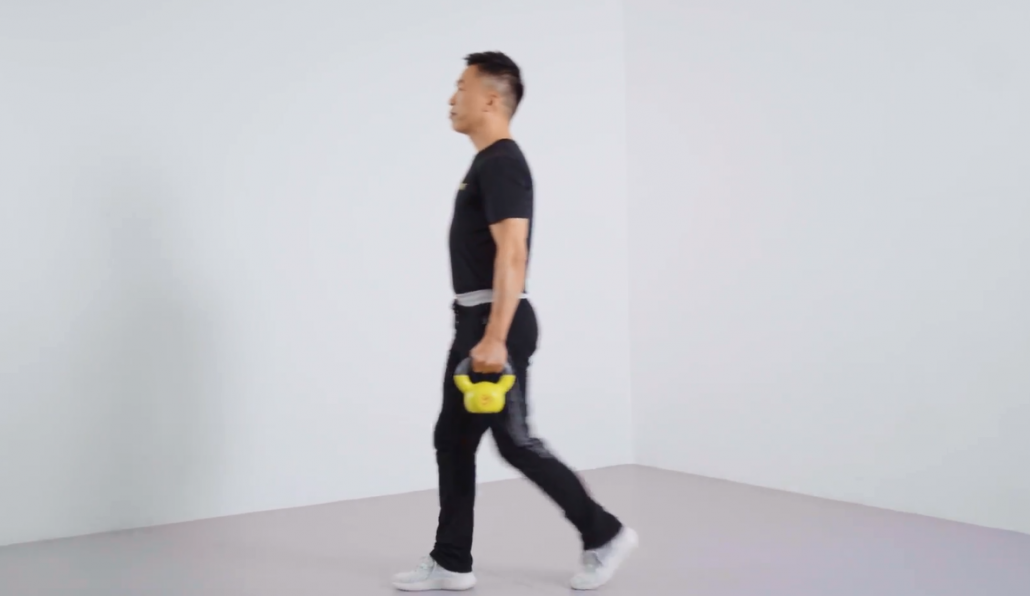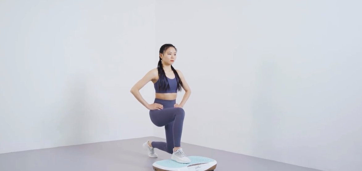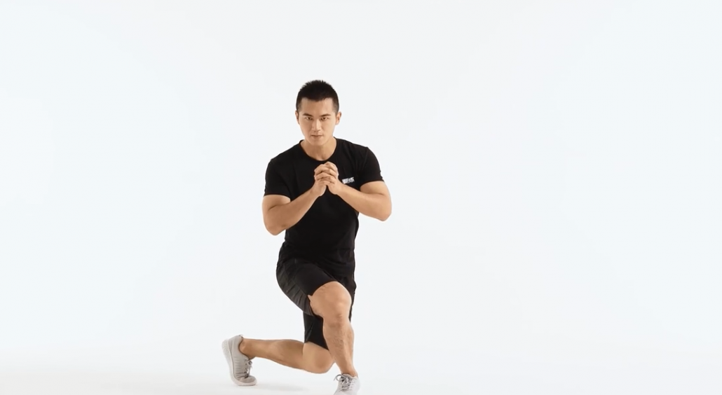 Feet apart, shoulder-width apart, left leg step forward in a lunge position, squatting while the knee of the front leg does not exceed the toes and the knee of the back leg does not touch the ground.