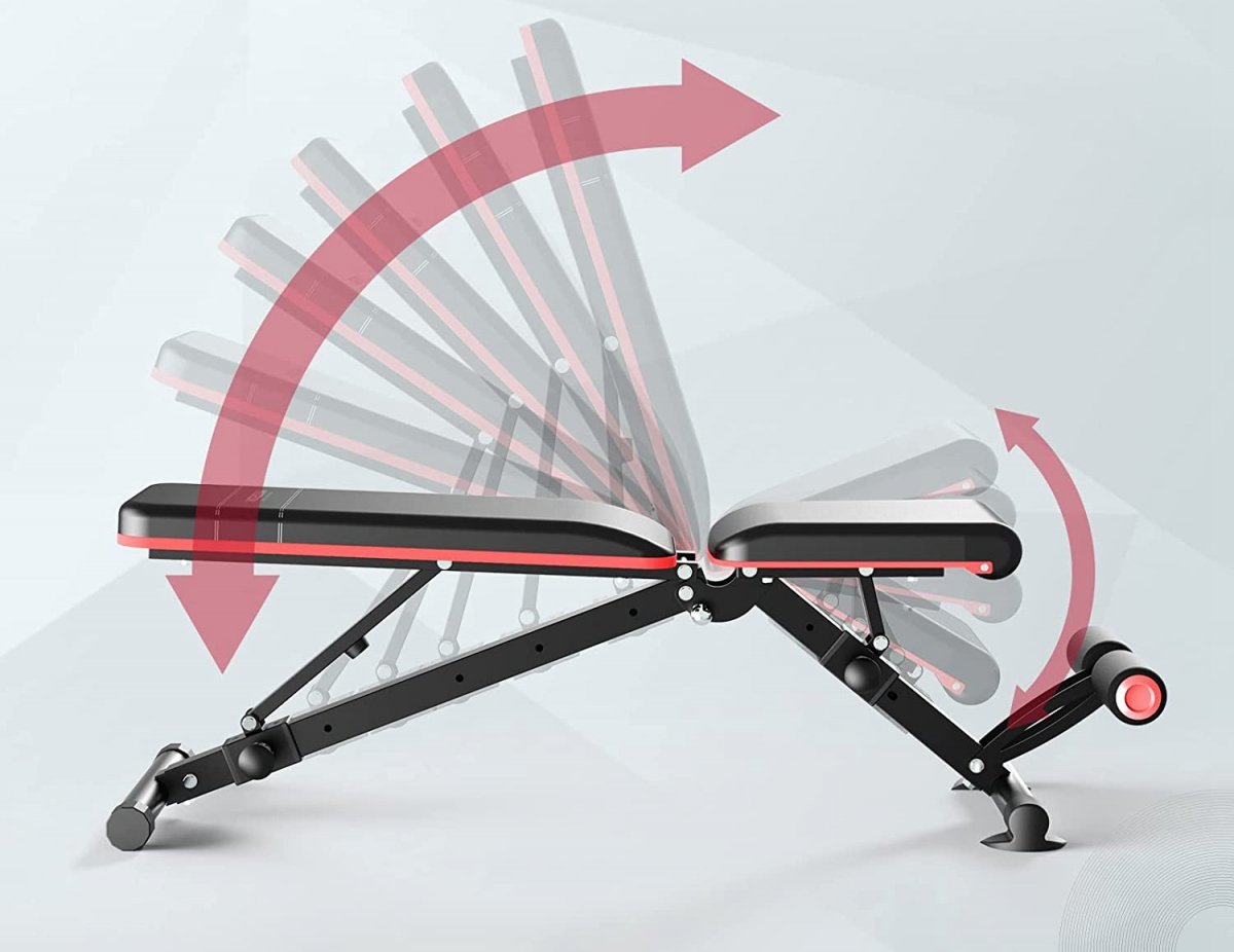 Designed with 6 back positions & 5 seat positions for a full-body workout, you are free to adjust the bench with various movements to do dumbbell exercise, push-ups, pull-ups, sit-ups, abdomen exercise, Push barbell exercise, Sit dumbbell press, Bent-Over Row, Plate arm flexed and extended and so on to training on your chest, shoulders, back, abs, and more.