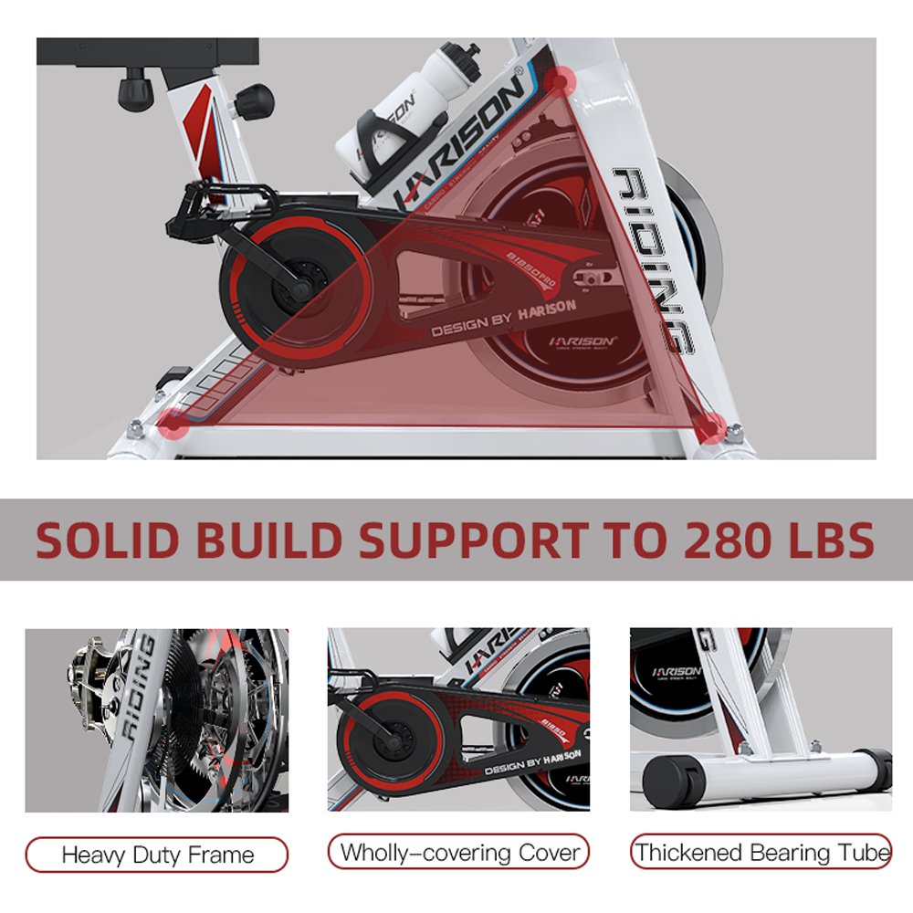 Thickened and weighted frame tube and 280lbs max user weight make the stationary exercise bike particularly stable and durable. Wholly-coving cover, high strength cranks, and High precision parts Long carrying your high-speed smooth cycling workout.