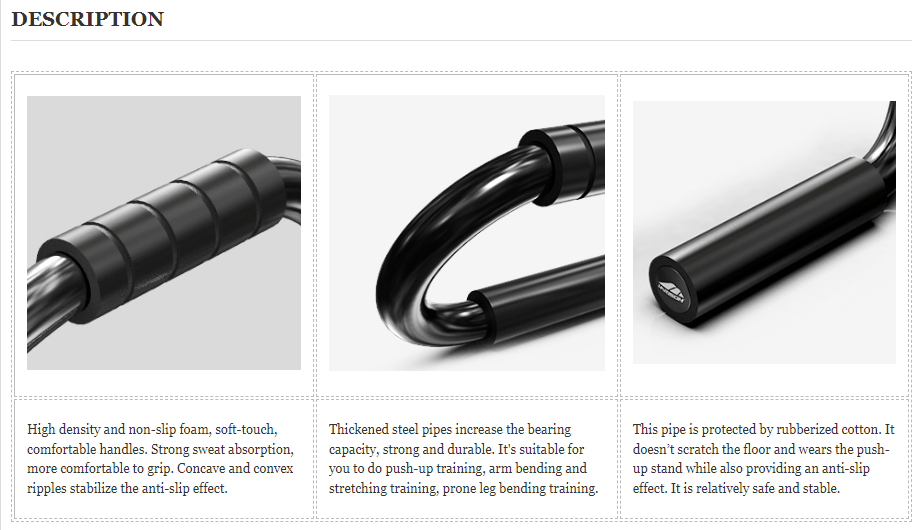 A: Use HR-419 Push Up Bars can do regular push-ups exercise such as doing push-ups and cardio workouts, your chest muscles, triceps, abdominal muscles, and back muscles can be trained effectively.